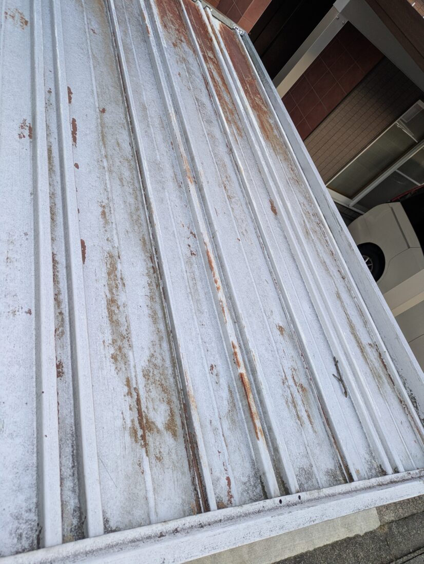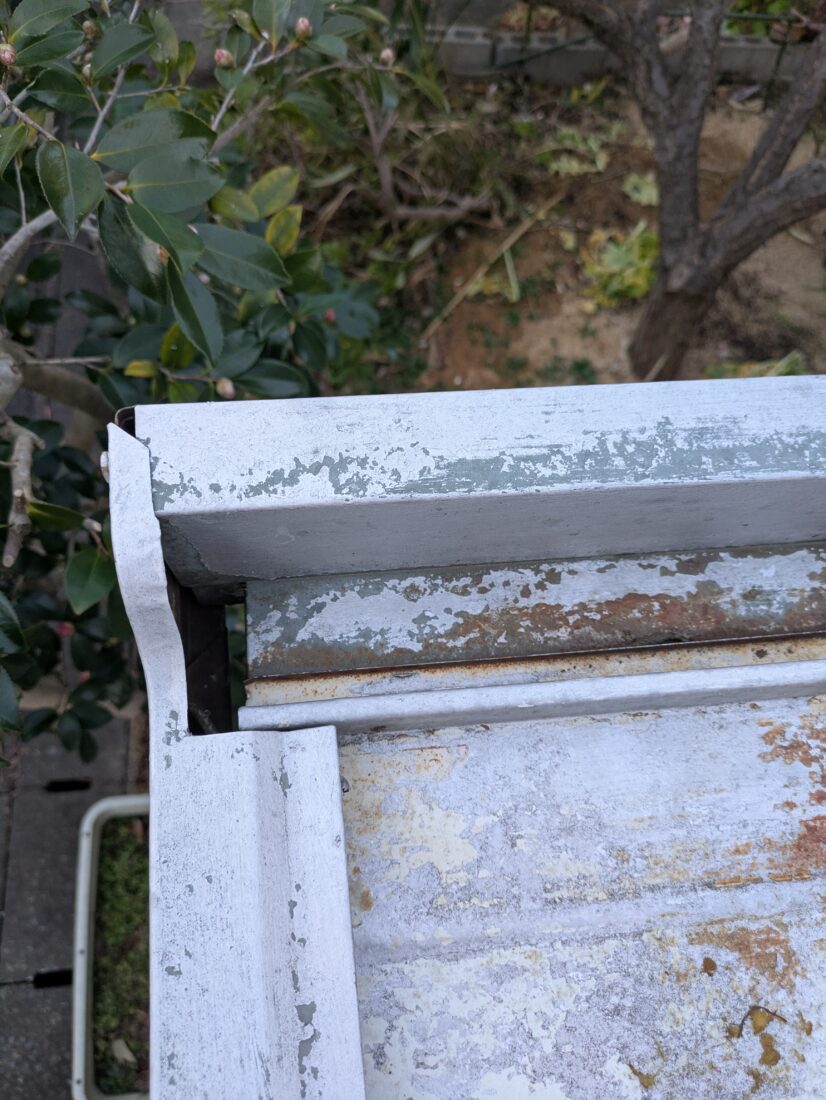 現地を確認したところ、金属屋根全体に塗膜の劣化やサビの発生が見られ、一部では雨水が屋根内部に回り込んでいる状態でした。