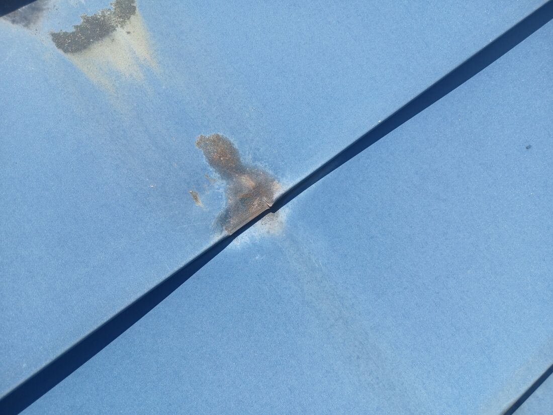 屋根材表面に部分的な錆が発生。塗膜が切れ、水が滞留しやすくなっています。