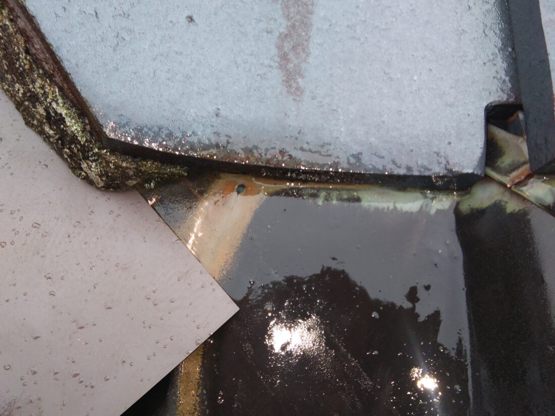 写真のとおり、谷板金の表面劣化・腐食、瓦際の土やゴミの堆積が見られ、雨水の流れが阻害されていました。新潟市秋葉区は降雨・降雪が多く、谷部は特に雨漏りリスクが高い要注意ポイントです。