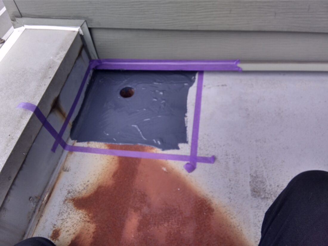 今回の写真は、ベランダ(または庇)ドレン周りからの雨漏りに対する補修工程です。