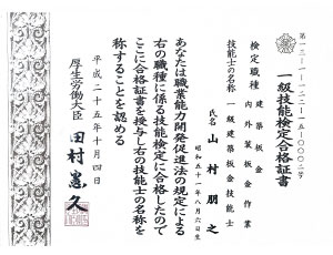厚労大臣認定 一級建築板金技能士(第13-1-122-15-0002号/山村 朋之)