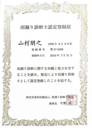 雨漏り診断士協会認定 雨漏り診断士(第27-0082/山村 朋之)