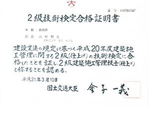 国交大臣認定 2級建築施工管理技士(B082301347/山村 朋之)