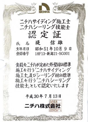 ニチハサイディング施工士(18F13-新潟21-SG001/堤 信雄)