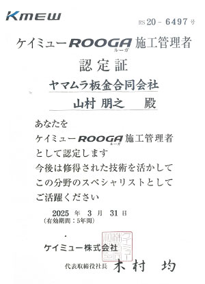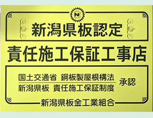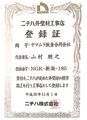 | 工事店登録 | 新潟県板金工業組合認定 責任施工保証工事店 KMEW登録工事店(NG18-022/ヤマムラ板金 合同会社) ニチハ外壁材工事店(NGK-新潟-185/ヤマムラ板金 合同会社) |