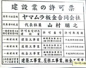 | 許認可 | 建設業新潟県知事許可(般-04)第45465号【建築工事業・屋根工事業・板金工事業】 |