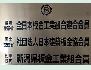 | 所属団体 | 全日本板金工業組合連合会 会員(経済産業省) 社団法人 日本建築板金協会 会員(国土交通省) 新潟県板金工業組合 組合員(知事認可) 日本窯業外装材協会 施工会員(D0172/ヤマムラ板金 合同会社) 新津建築組合 会員 新津商工会議所 会員 |