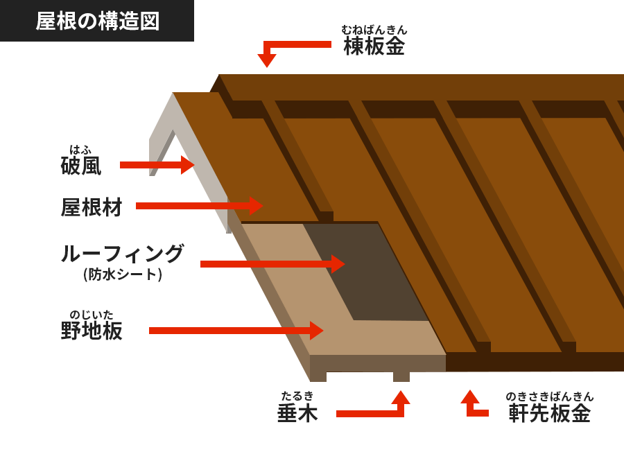 屋根の骨組みの上に張られる板のことです。屋根材を支える土台となる重要な部分です。